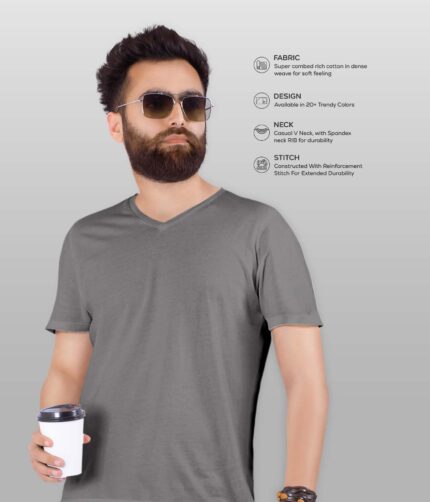Men’s V Neck Half Sleeve solid colour T-Shirt – Charcoal melange